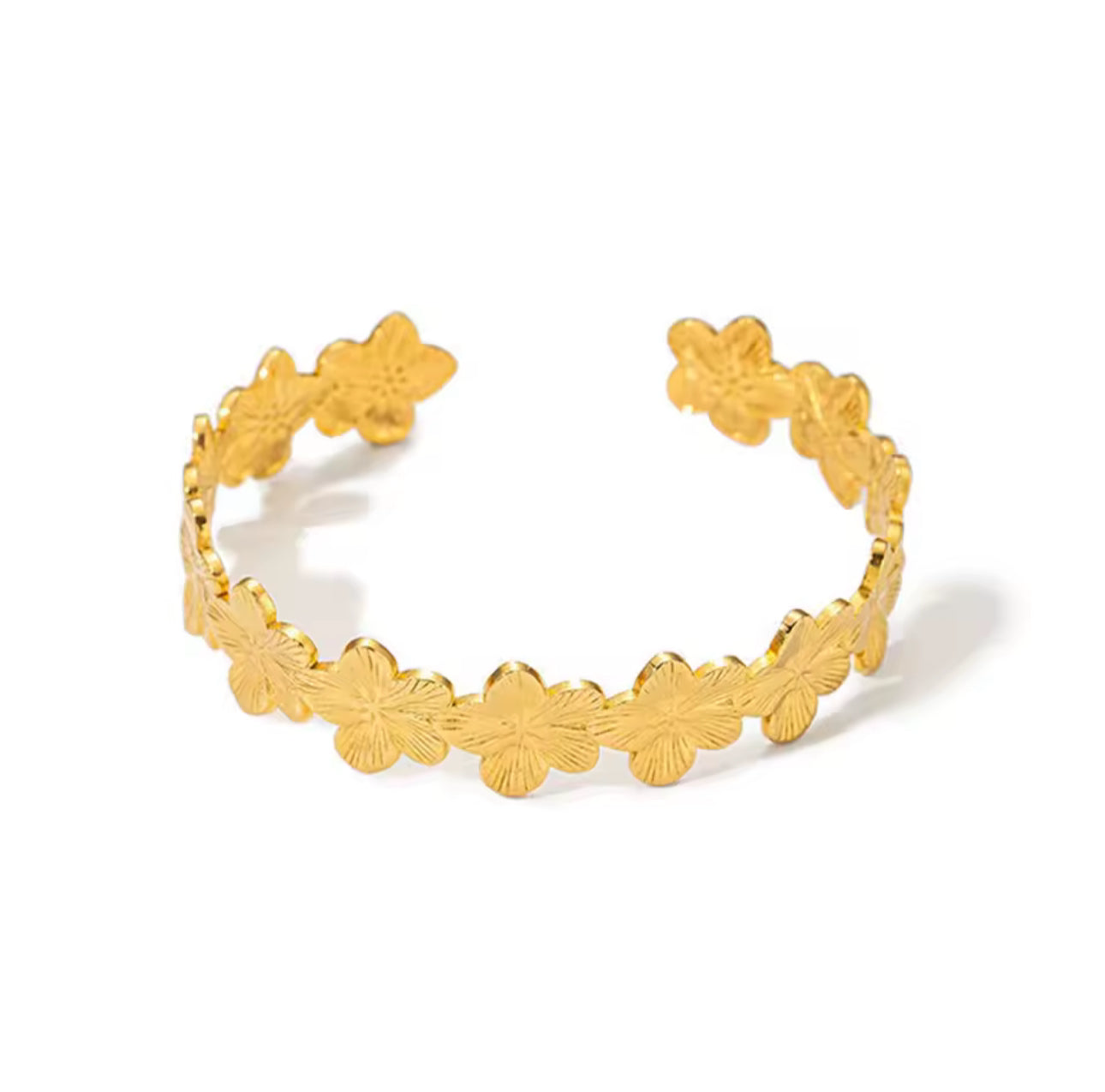 Ce bijou doré à larges fleurs en relief sublime le poignet avec élégance et caractère. Fabriqué en acier inoxydable plaqué or 18k, il est résistant à l’eau et conçu pour durer 💛